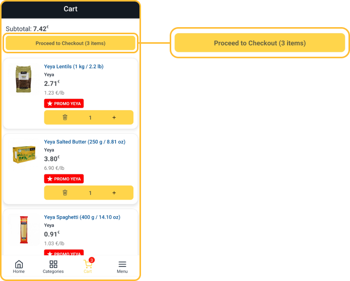 Go to your cart, using the cart icon located in the bottom menu, and ensure everything is correct. Adjust quantities or remove items if necessary.