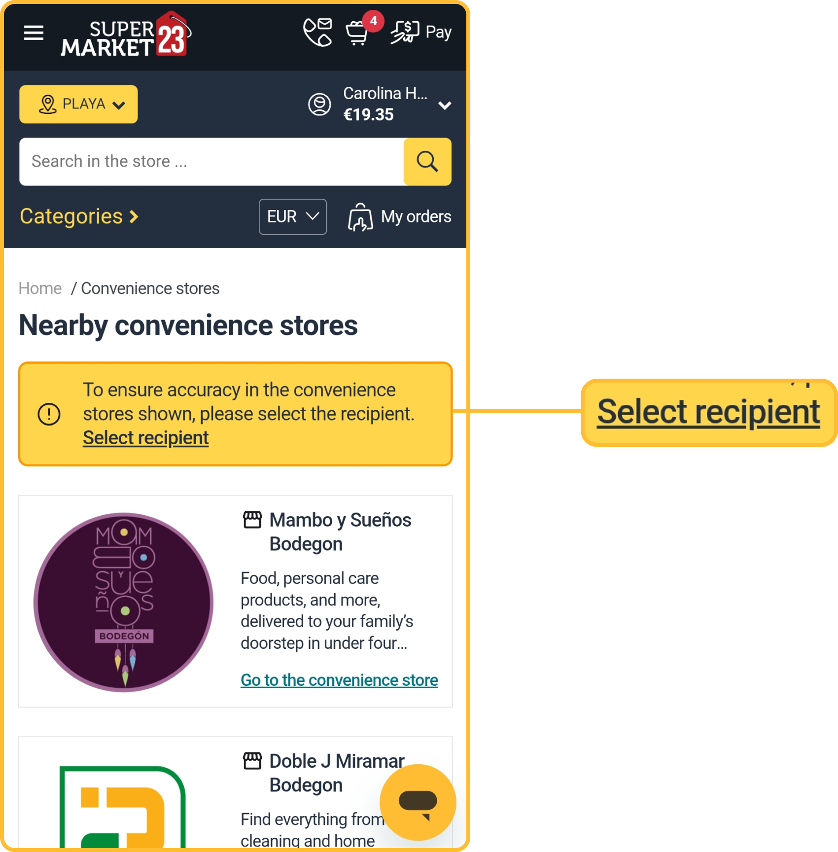 - Select an already saved recipient or create a new one to see the available Convenience Stores in your area. Make sure to provide the correct address (street + house or building number, apartment, between adjacent streets, neighborhood or district, municipality, province); otherwise, no Convenience Stores will be available for purchase.