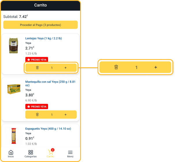 El carrito está ubicado en el menú inferior de la aplicación. Al hacer clic verá todos los productos asociados a su cuenta, junto a sus cantidades. Para cambiarlas solo debe pinchar en los signos + o - . Para eliminar un artículo use el ícono de la papelera.