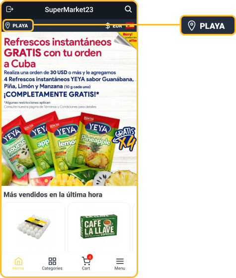 Explore las categorías de productos en el ícono y añada los que desee a su compra.