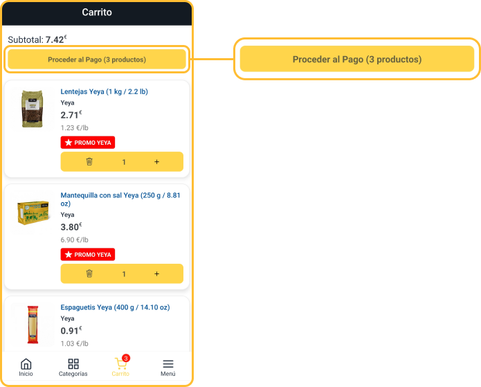 Diríjase a su carrito, en el ícono del carrito que está en el menú inferior, y asegúrese de que todo este correcto. Ajuste cantidades o elimine productos si es necesario.
