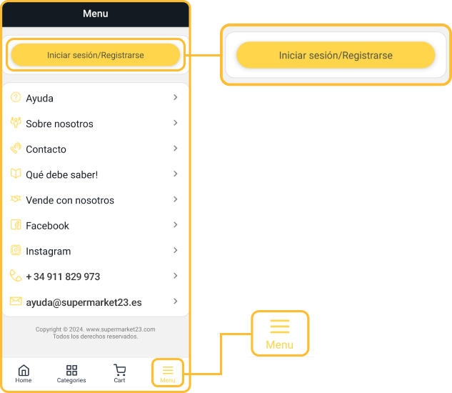 Haga clic en el Menú, y luego en el botón amarillo "Iniciar sesión/Registrarse".