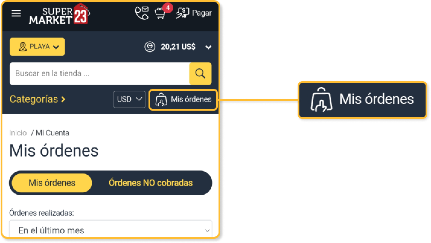 Para comenzar a hacer seguimiento de su pedido, simplemente diríjase a la sección "Mis Órdenes", que se encuentra en la página de inicio de Supermarket23 al lado de su nombre de usuario.