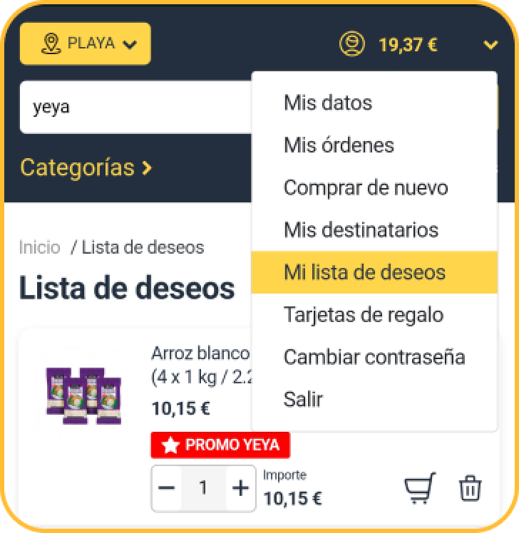 - Para acceder a su lista, inicie sesión en su cuenta y haga clic en la sección "Lista de Deseos" en el menú de la tienda, al final de la página o haciendo click en su nombre de usuario.